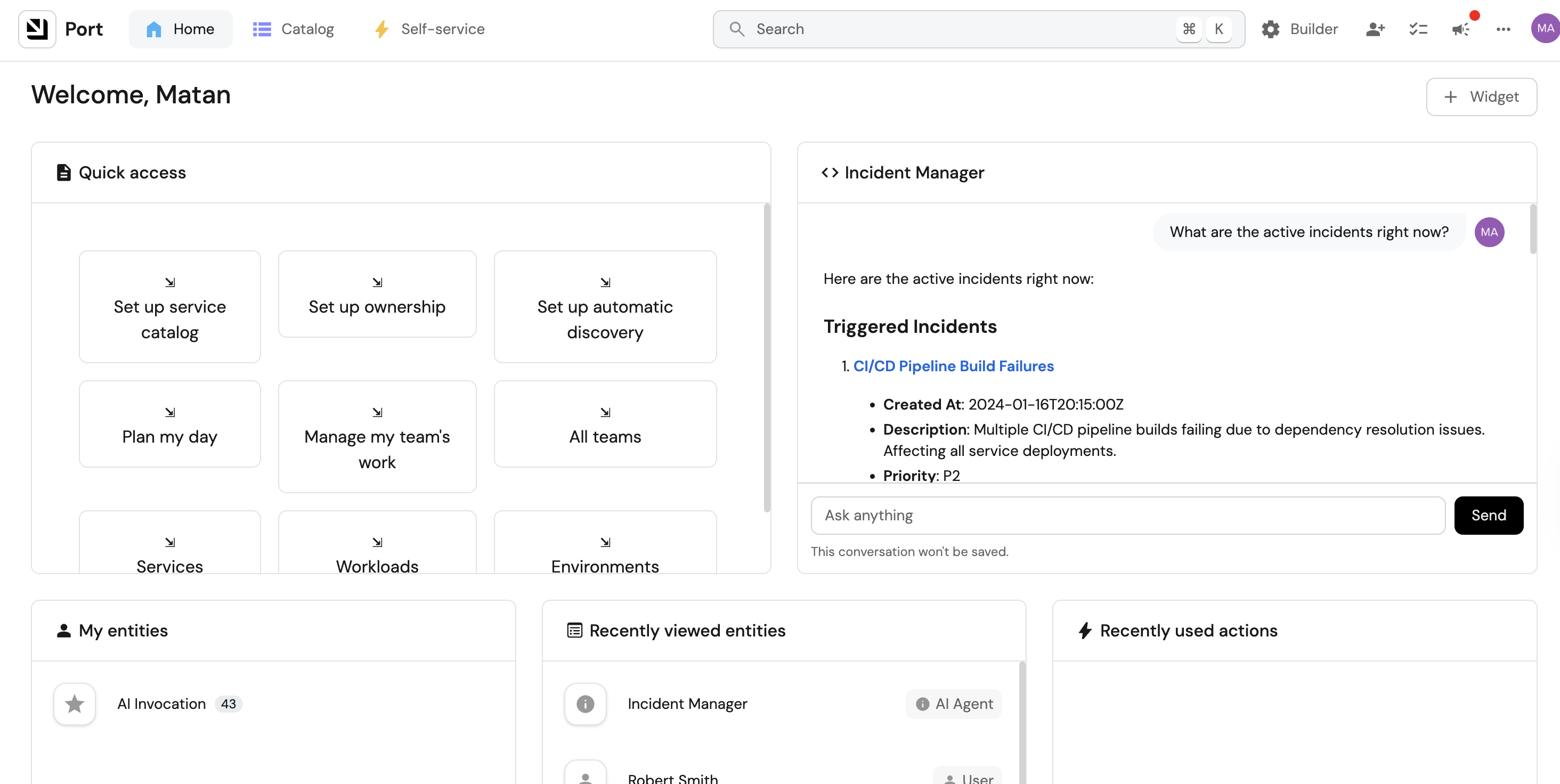 Port AI agents are customizable building blocks that enhance your developer portal with intelligent assistance.