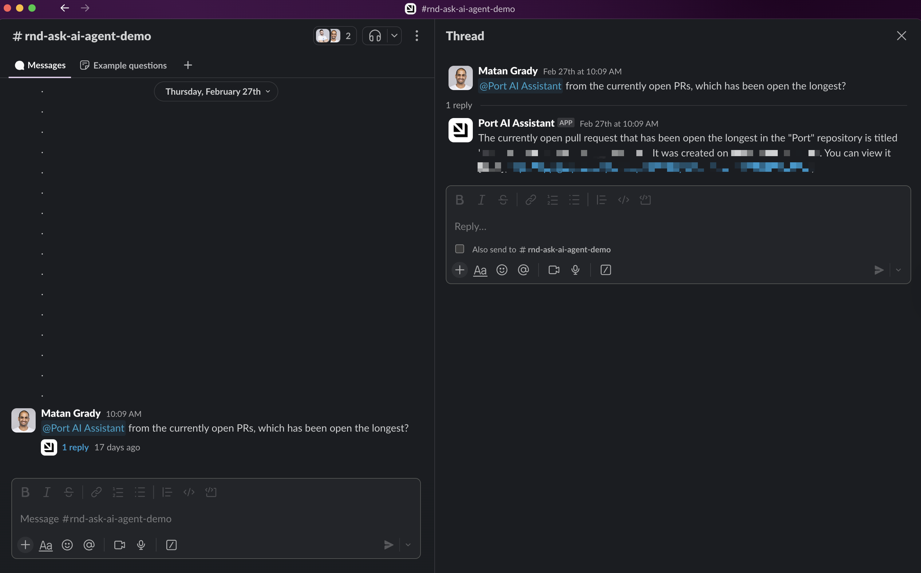 Answer questions about your development environment, services, and processes using natural language. Developers can ask questions and get immediate, contextual answers.