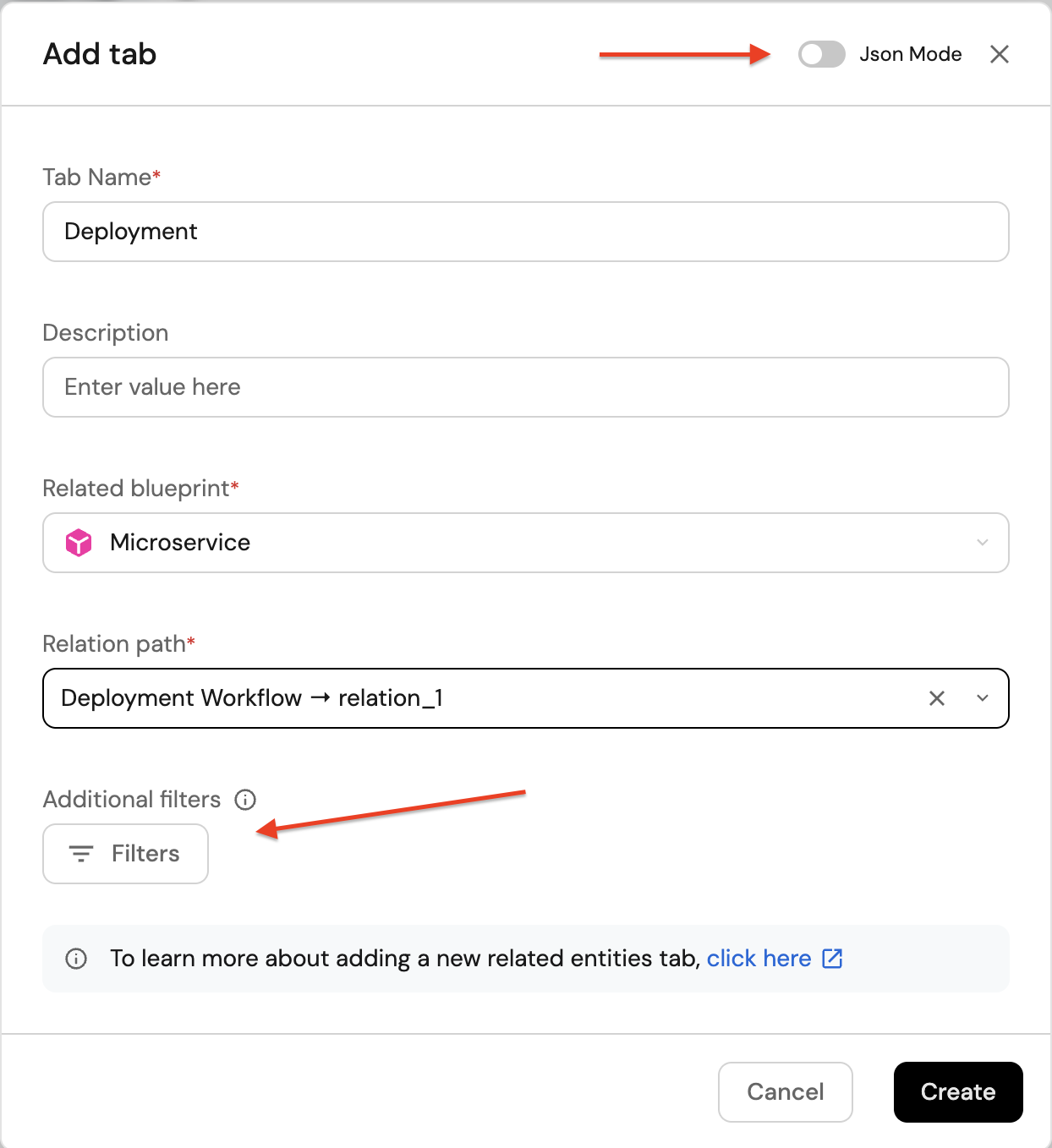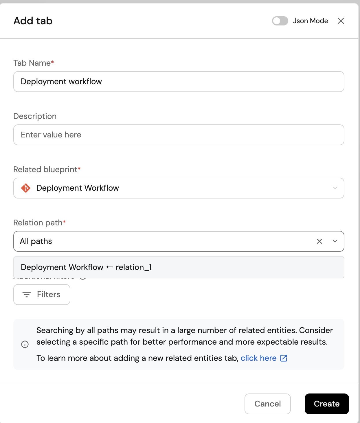 Json modein the "Add tab" dialog to define the relationship path with precise control over hops.For example if we want to make 2 hops then we would have to specify 2 self relation blueprint identifiers in the path array.