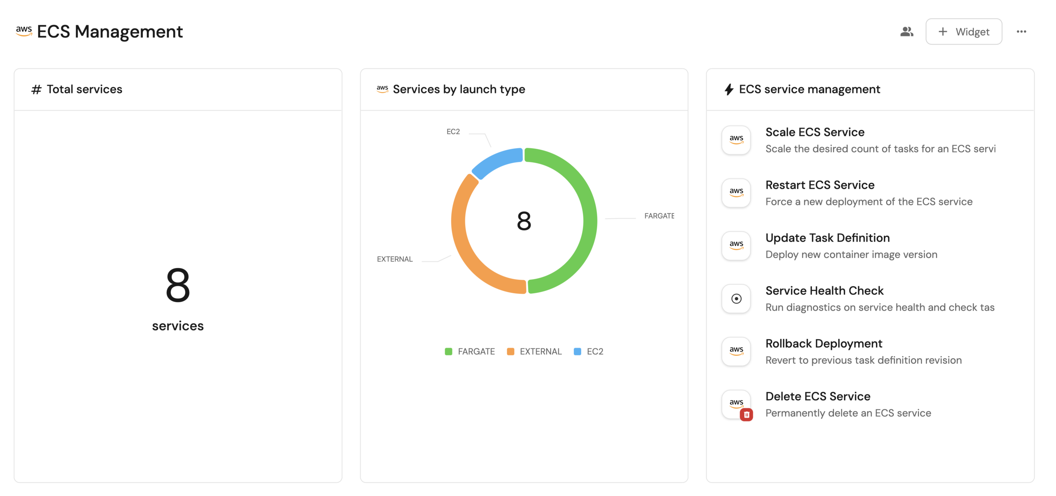 With your data and actions in place, we can create a dedicated dashboard in Port to visualize all ECS services by state, launch type, or cluster using customizable widgets. In addition, we can trigger actions (scale, restart) directly from the dashboard.