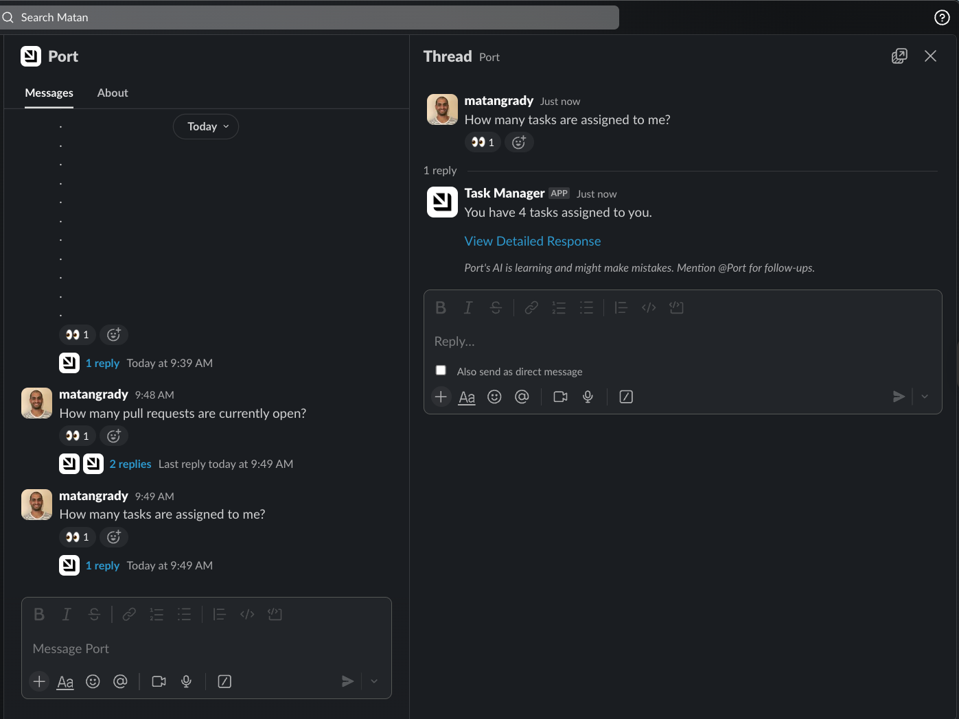 The Slack integration provides a natural way to interact with the Task Manager agent. Before using this method, ensure you have installed and configured the Port AI Assistant Slack App