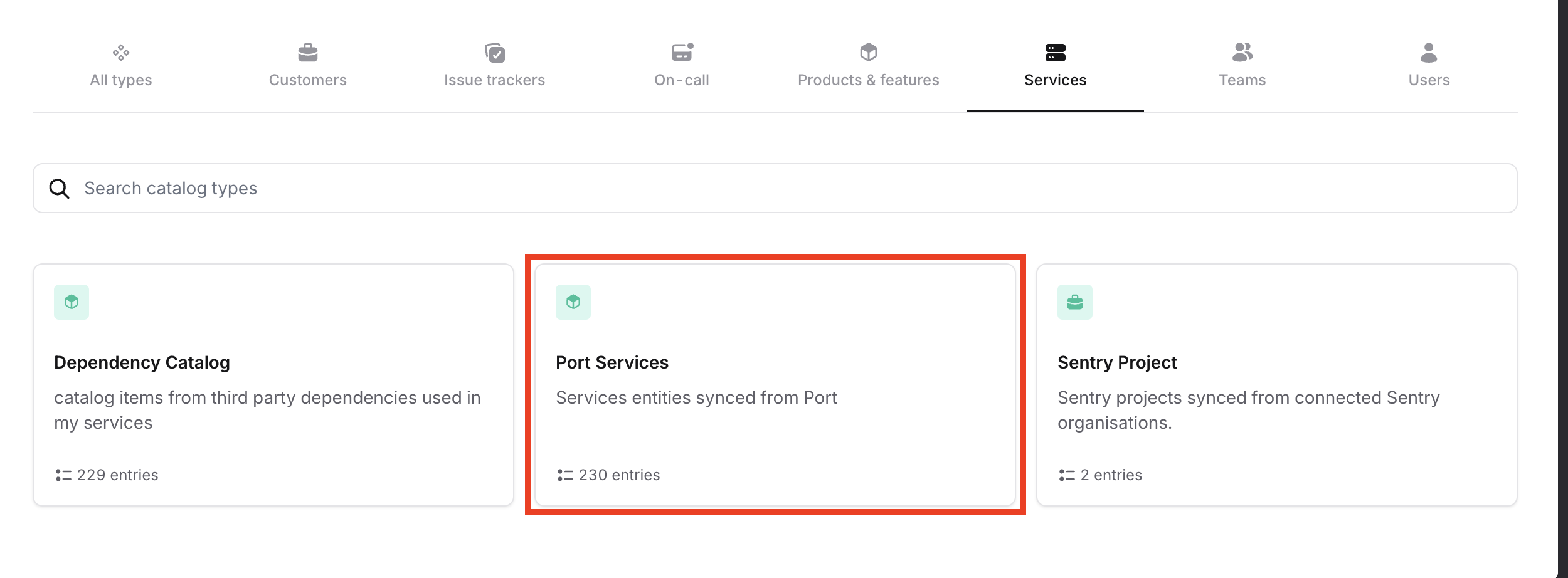 Port Servicescatalog type or any custom name you provided. - You should now see the synced service entities from Port listed under this catalog type, giving you improved visibility and context for managing incidents.