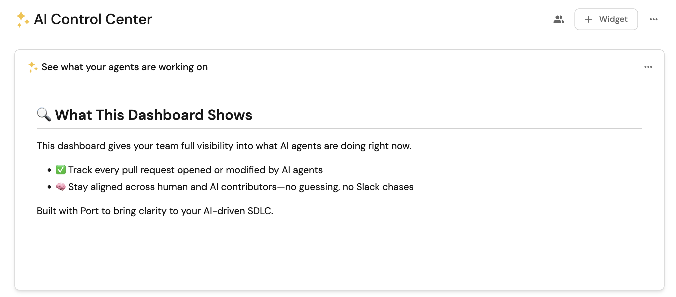 As engineering teams integrate AI coding agents like GitHub Copilot, Claude, and Devin into their workflows, they face the challenge of managing an increased volume of pull requests. Tracking and reviewing these AI-generated contributions can be overwhelming without a centralized system. Port's AI control center addresses this issue by identifying pull requests originating from coding agents and displaying them in real-time, allowing you to efficiently monitor and act upon them.