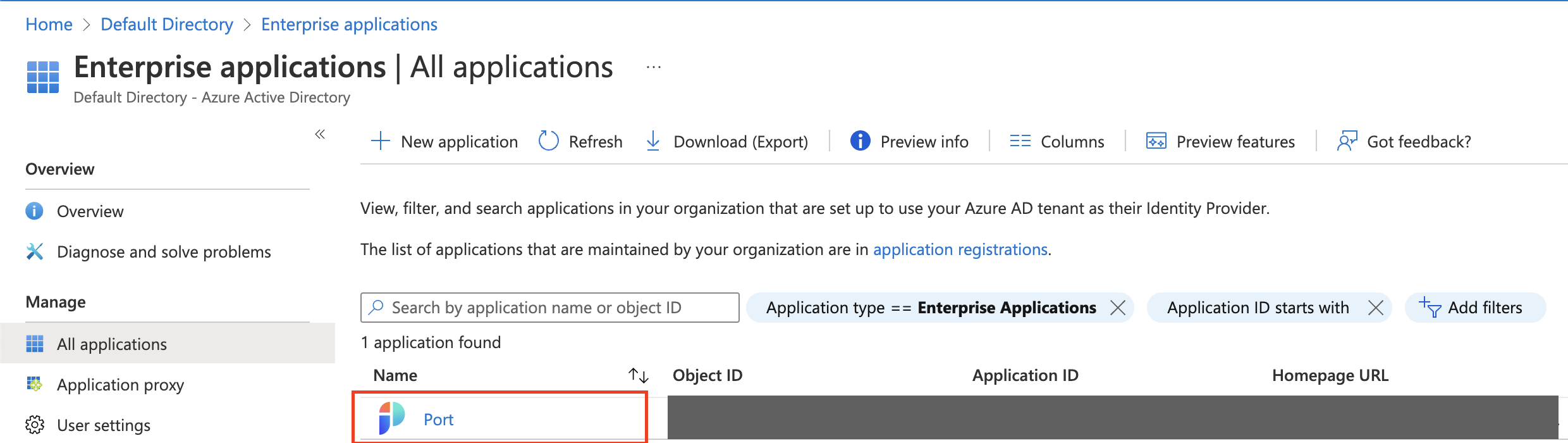 Application (Client) ID, which appears on the Port application overview page: